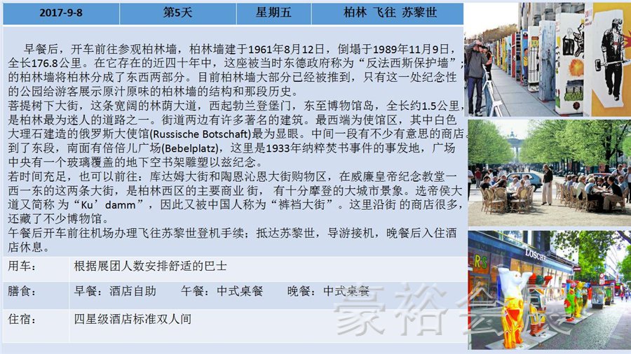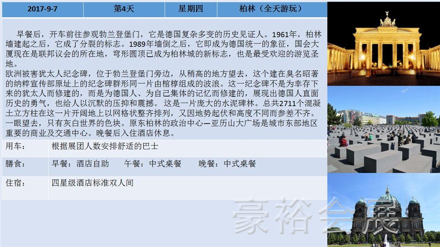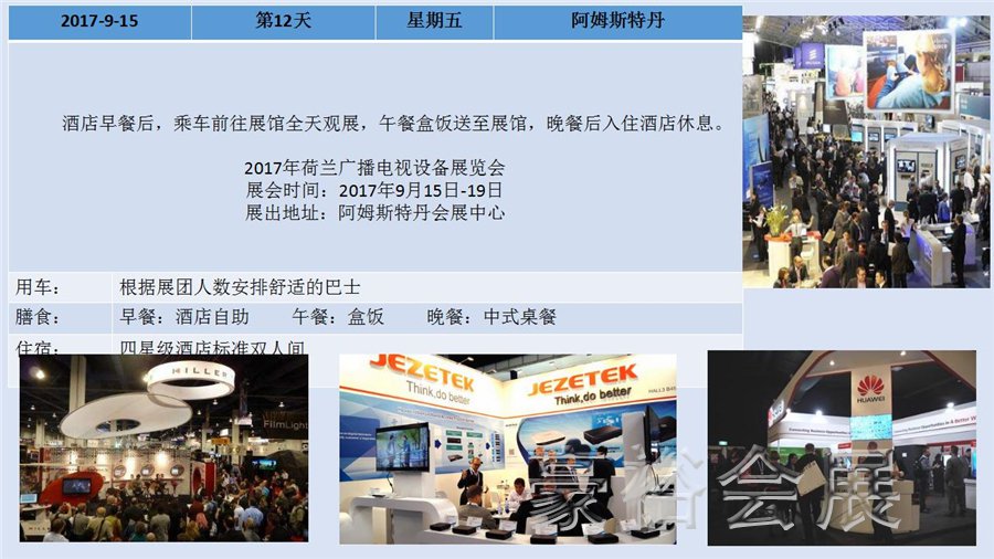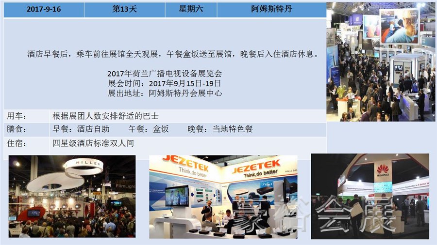 德國柏林國際電子消費類展(2017年9月1日至6日)及荷蘭廣播電視設(shè)備展(2017年9月15日至19日),展會展出產(chǎn)品包括各式家庭娛樂電子產(chǎn)品、音響娛樂電子產(chǎn)品、通訊產(chǎn)品、家用電器產(chǎn)品、教育視聽產(chǎn)品等,兩展時間臨近,豪裕團隊也特地為此次報名兩展的客戶安排了歐洲四國游及展會考察行程,接下來,跟隨我們的步伐了解下整個行程安排吧: